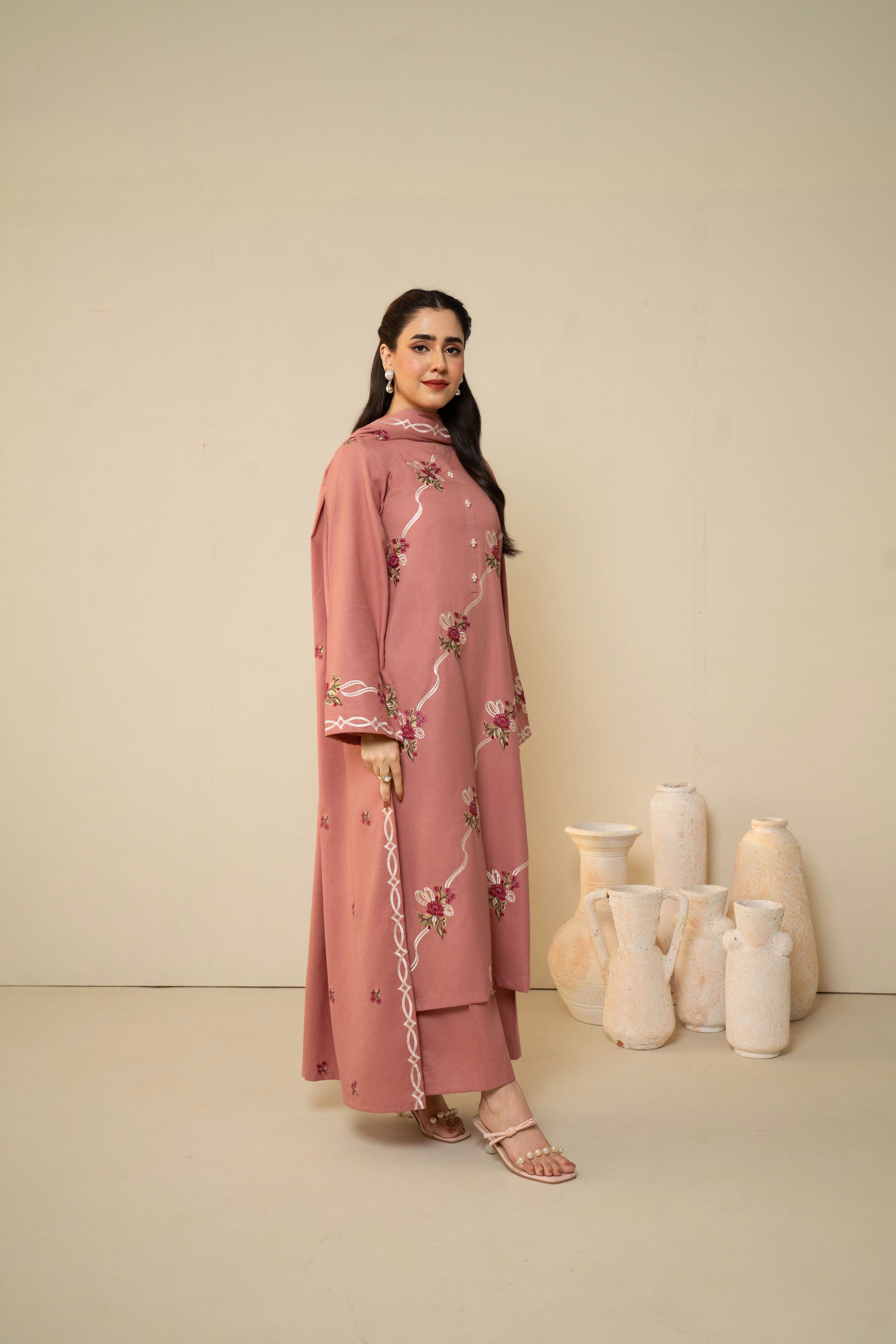 FLORENT - 3PC DHANAK EMBROIDERED SHIRT WITH DHANAK EMBROIDERED SHAWL AND TROUSER - HZG2603