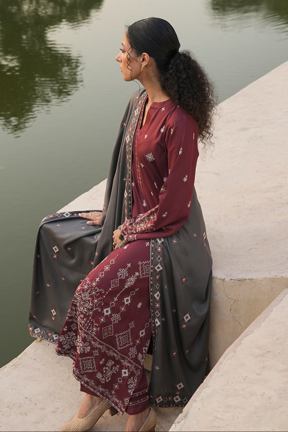 IMAGE - 3PC DHANAK EMBROIDERED SHIRT WITH DHANAK EMBROIDERED SHAWL AND TROUSER - HZG2544