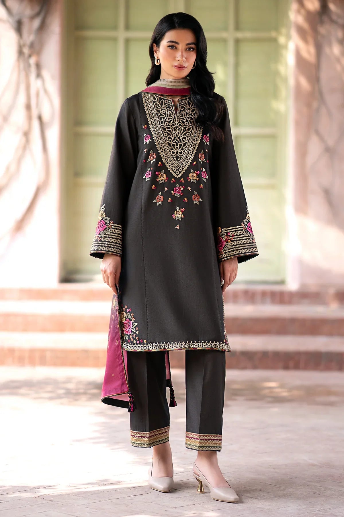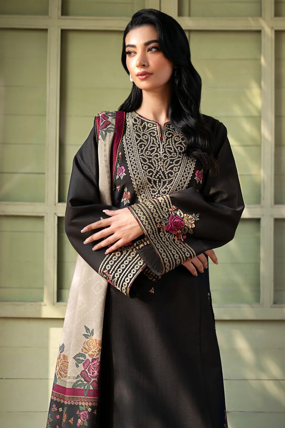 Increase quantity for JAZMIN - 3PC KHADDAR EMBROIDERED SHIRT WITH PRINTED TWILL SHAWL AND TROUSER - HZG1797