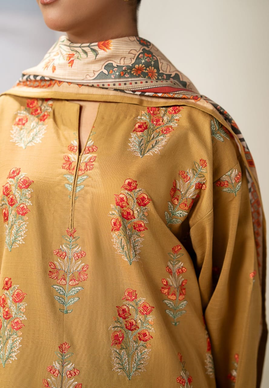 SAPPHIRE - 3PC DHANAK EMBROIDERED SHIRT WITH TWILL PRINTED SHAWL AND TROUSER - HZG1949